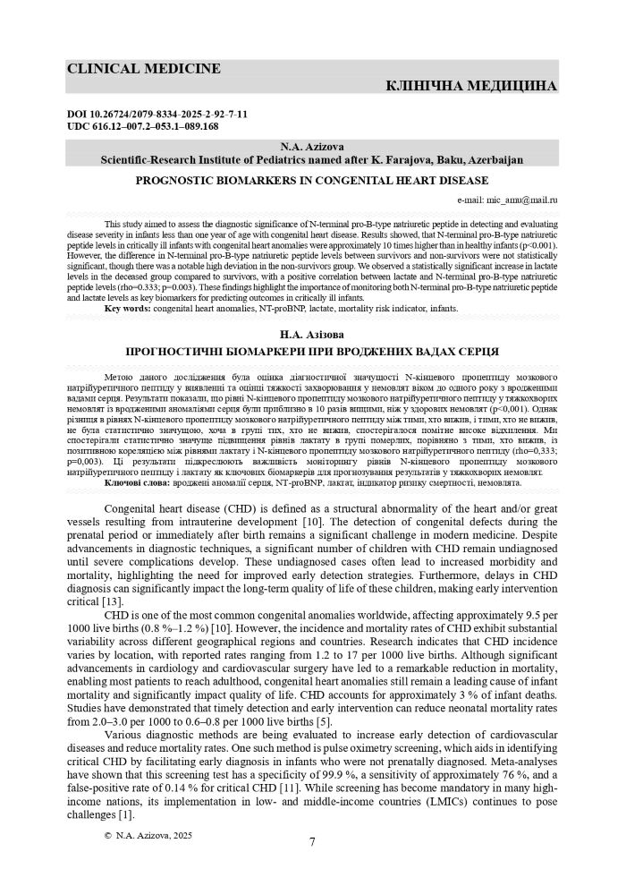 Pediatriya.az saytının təsisçisi, tanınmış həkim Nərmin Əzizovanın “Prognostic biomarkers in congenital heart disease” (DOI: 10.26724/2079-8334-2025-2-92-7-11) adlı elmi məqaləsi nüfuzlu World of Medicine and Biology jurnalında (Web of Science – ESCI) dərc olunmuşdur.